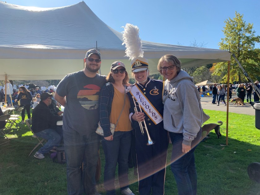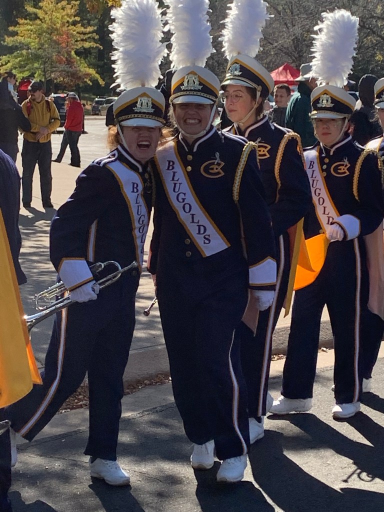 Feeling over-tired and emotional tonight. I had a really good time in Eau Claire with Emily and Tim. We went out for breakfast this morning and then headed over to the UW-Eau Claire Homecoming Game to watch the marching band. We got there early enough to chat with Anna and her friend Ashleigh beforehand.