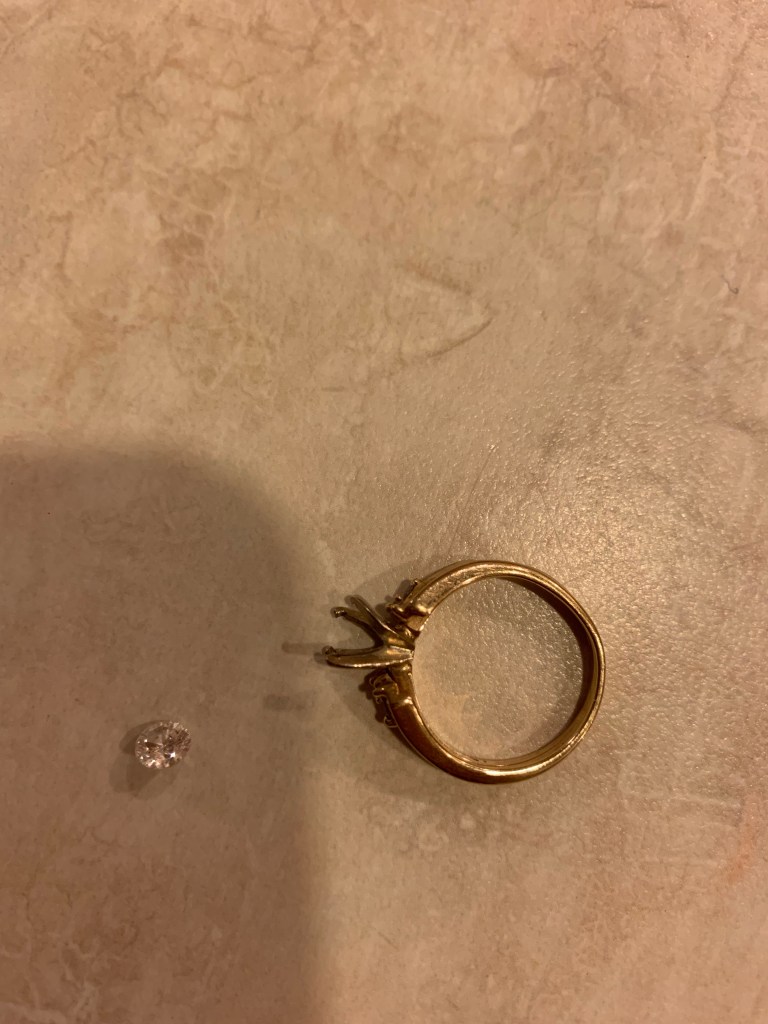 I was texting with my SIL a little bit ago while getting some lines down for a new poem that’s been rolling around in my head. My left thumb reached over to fidget with my wedding rings (Mine and Jason’s) on my ring finger….and instant panic…overly pokey prongs…one bent way over…and no diamond in my ring.