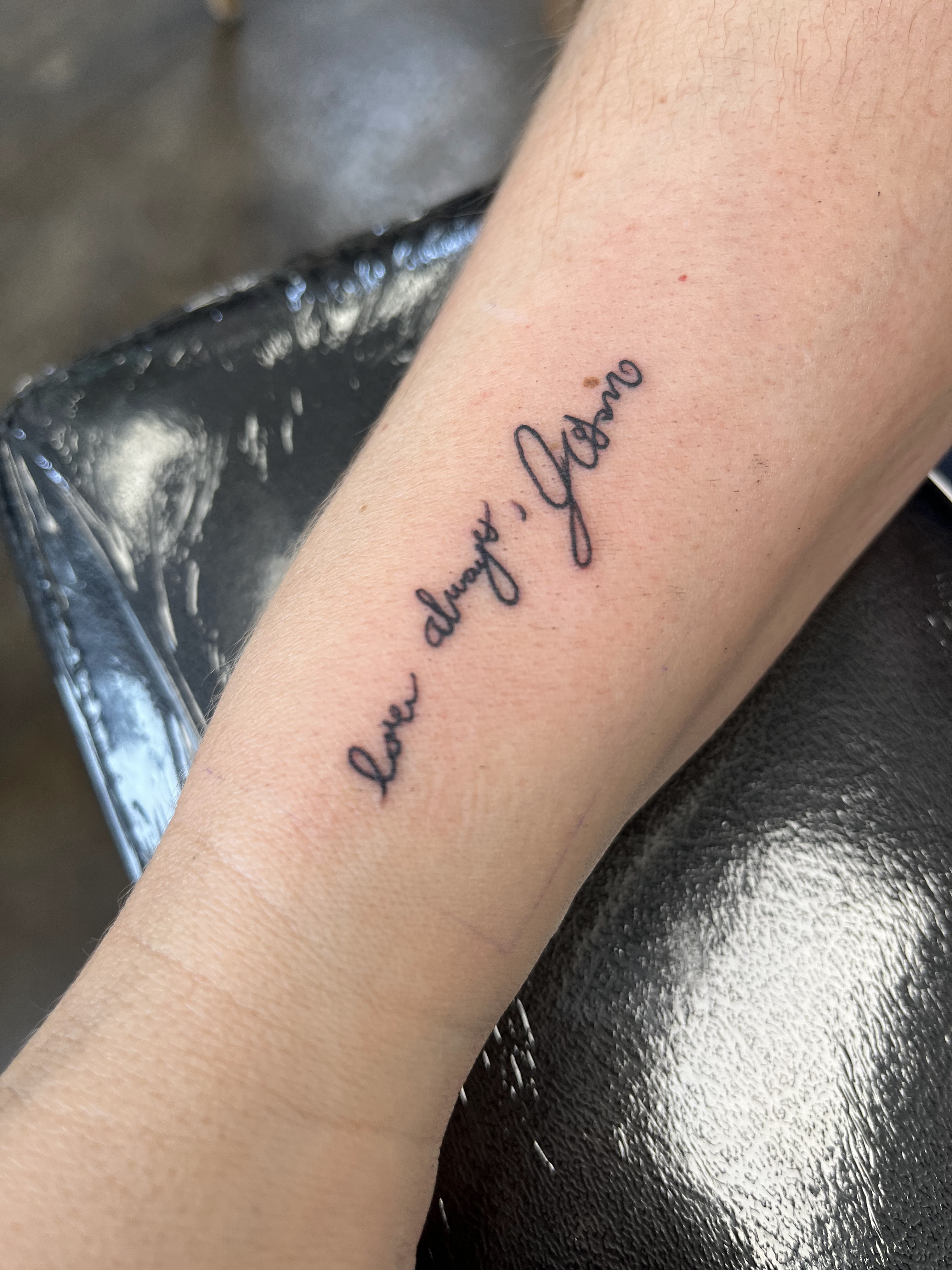 Third…I got a tattoo. Since Jason passed I have had the idea in my head that I wanted to get his handwriting on my forearm…where all I have to do is look down and know that I am still loved by him forever. It’s my first tattoo, so it took me a bit to get up the nerve…but damn…I love it so much. Arthur, the tattoo artist, was so nice and kind. He was covered in a zillion and one tattoos, but this guy cares so much about his craft and was 100% dedicated to making sure my tattoo is exactly how I want it…from the size to the exact spot it is on my arm. He chatted with me and let me talk about Jason….completely listening…not prying at all…just letting me know he cared about my story and what this tattoo means to me. I got all teary is his chair and he just let me be and was just so kind. Jason is not a fan of tattoos, but I feel like he’s okay with this one.