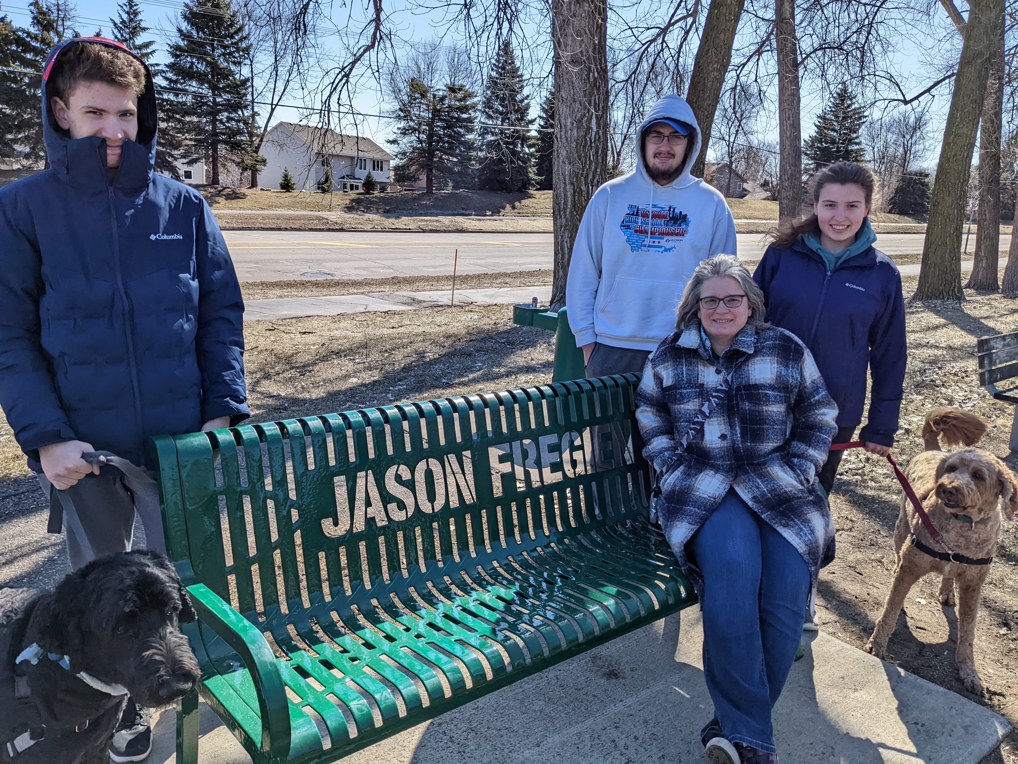 Today Jason’s Mom and Dad came up for a visit. They wanted to see the kids while they are home on Spring Break and also check out all the work we’ve been doing in the inside of the house the past couple months. We were also surprised to find out that the City installed Jason’s bench at Scott Park (corner of 140th and Galaxie) in Apple Valley. The kids and I, Jan and Kent, and Jeremy and Cheryl all went to check it out. Thank you to Jeremy and Cheryl for tirelessly working (fighting) with the City to get the bench installed. It is perfect and I’m so glad that the timing worked out for us all to go see it today.