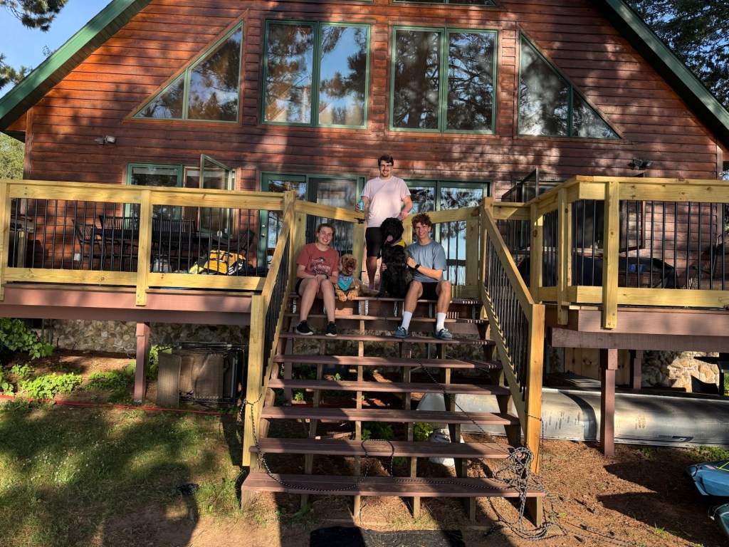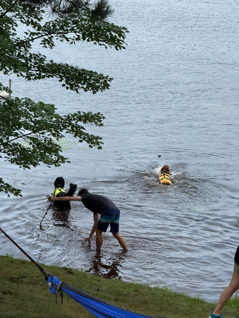 Our location was truly ideal for vacationing with the dogs. The cabin had a large gated deck across the whole back of it. We spent a lot of time out there. The gate was awesome because without it the dogs would have been in the water constantly. Playing with the dogs in the water was definitely a daily highlight. Emmett has always loved the water and remembered how to swim pretty quickly…even though it’s been about 5 years. Linc paced in the shallow water, watching his brother swim, for the first 5 days of vacation before he got brave enough to swim himself. We cheered him on when he finally took that step into the deeper water.